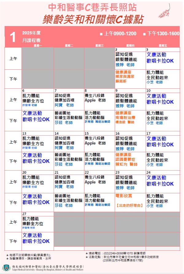114年1月醫事c關懷據點(中和分站)課程表
