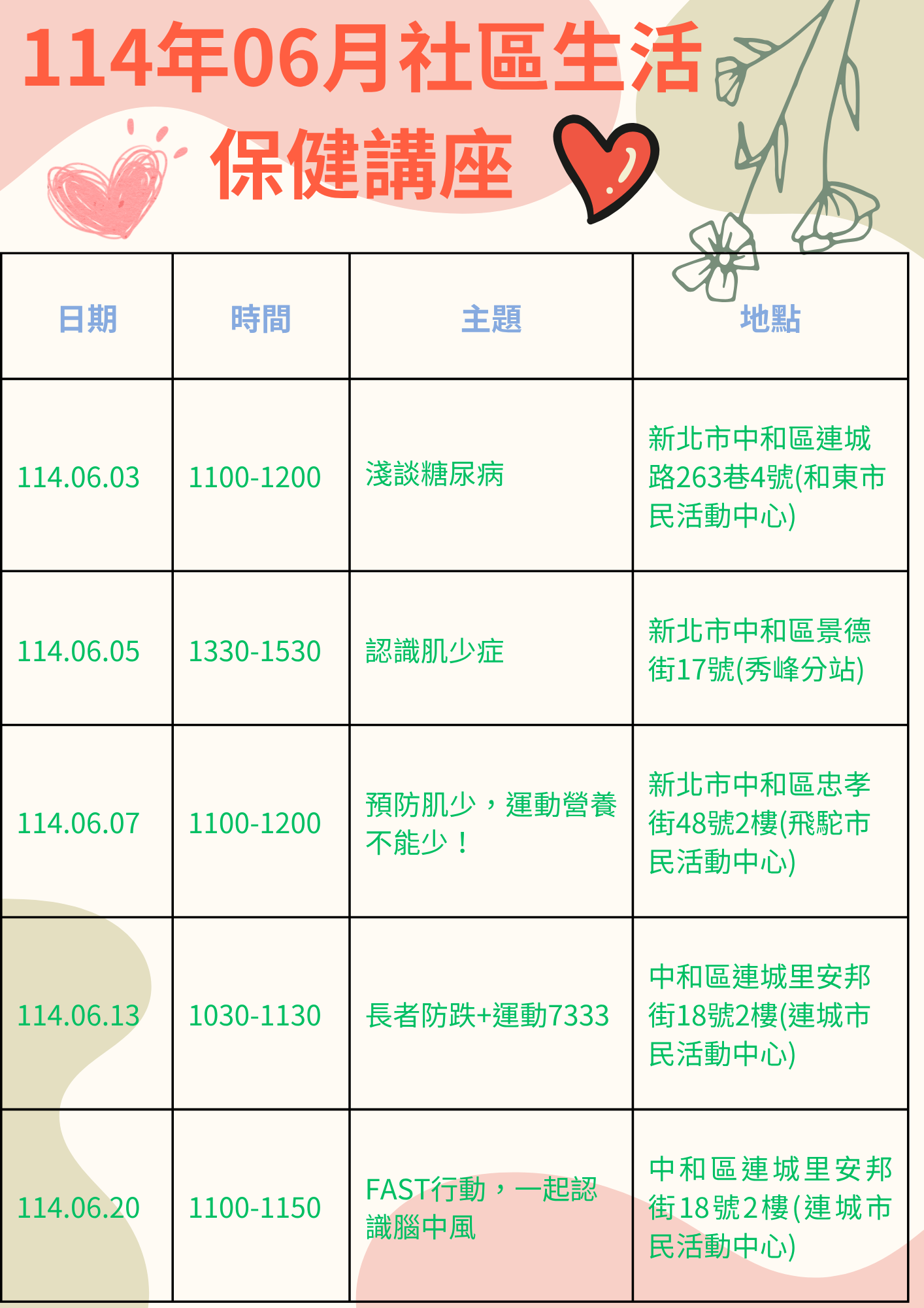 114年6月中和興南笑呵呵關懷據點課程表