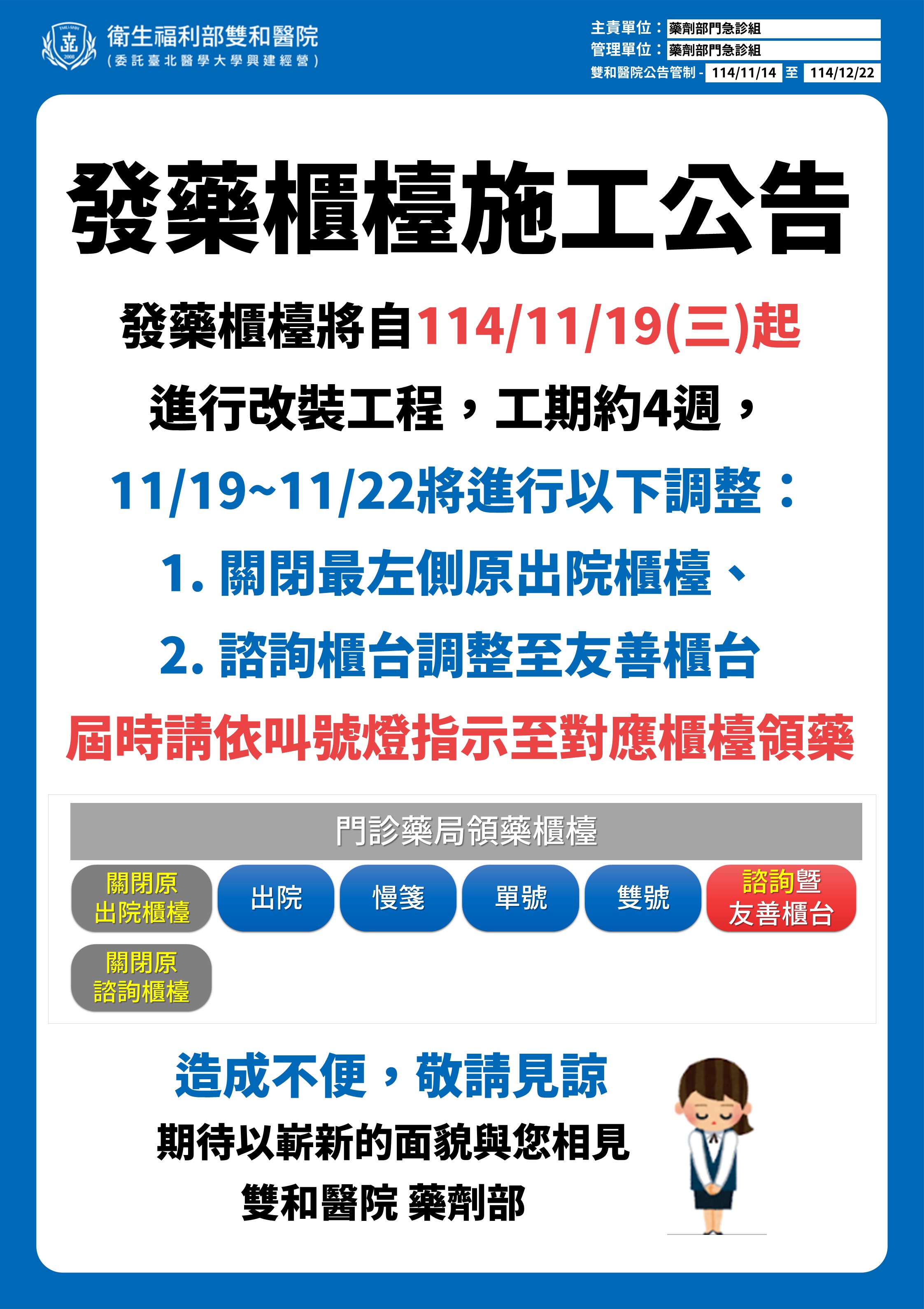 【重要公告】114.11.19起發藥櫃檯進行改裝工程 櫃檯異動公告