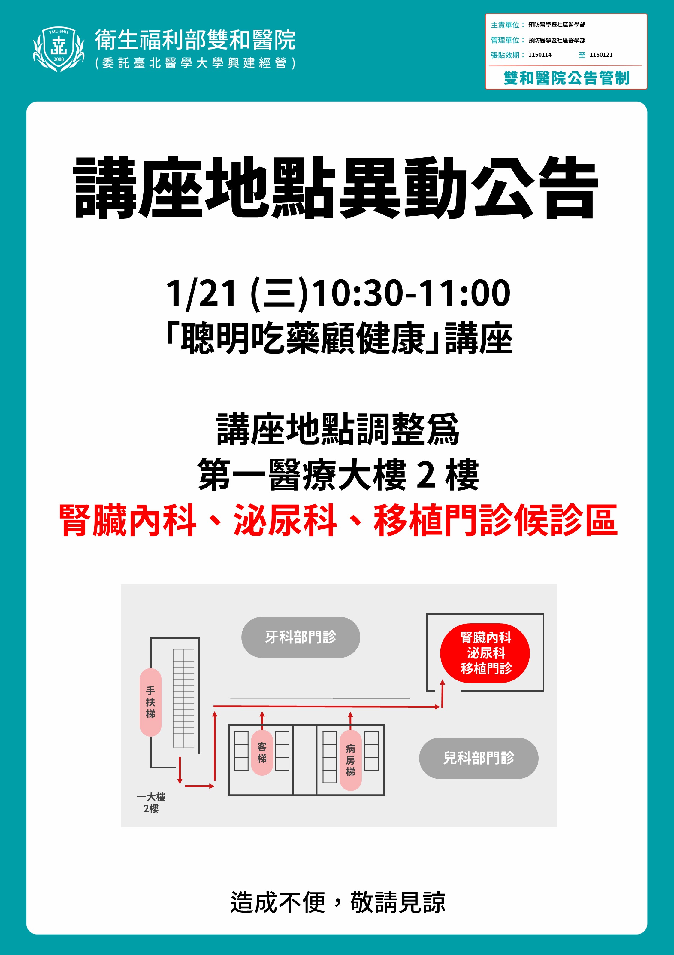 【重要公告】115.1.21「聰明吃藥顧健康」講座地點異動