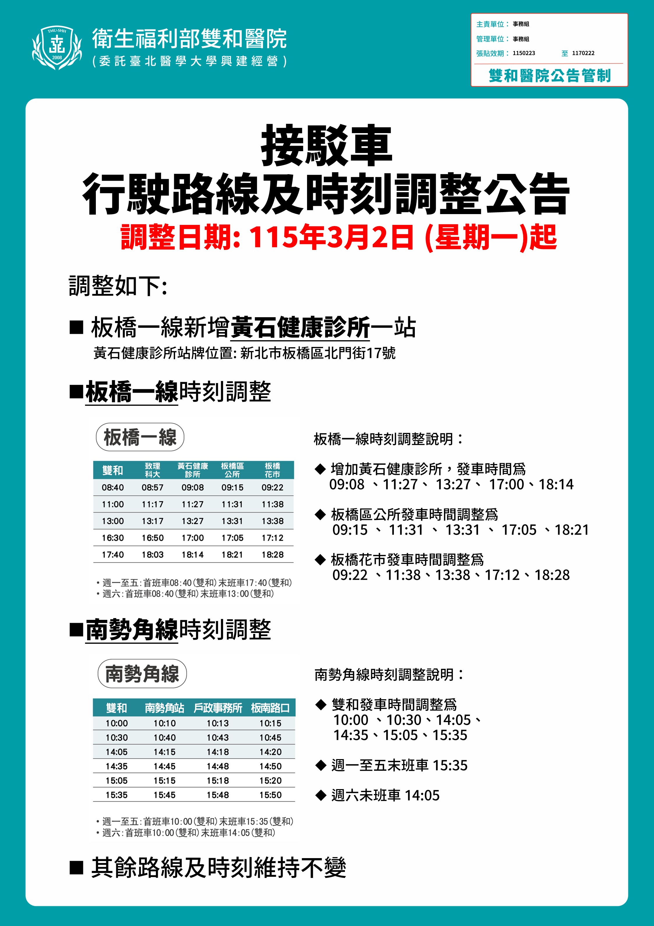 【重要公告】115年3月2日起接駁車行駛路線及時刻調整公告