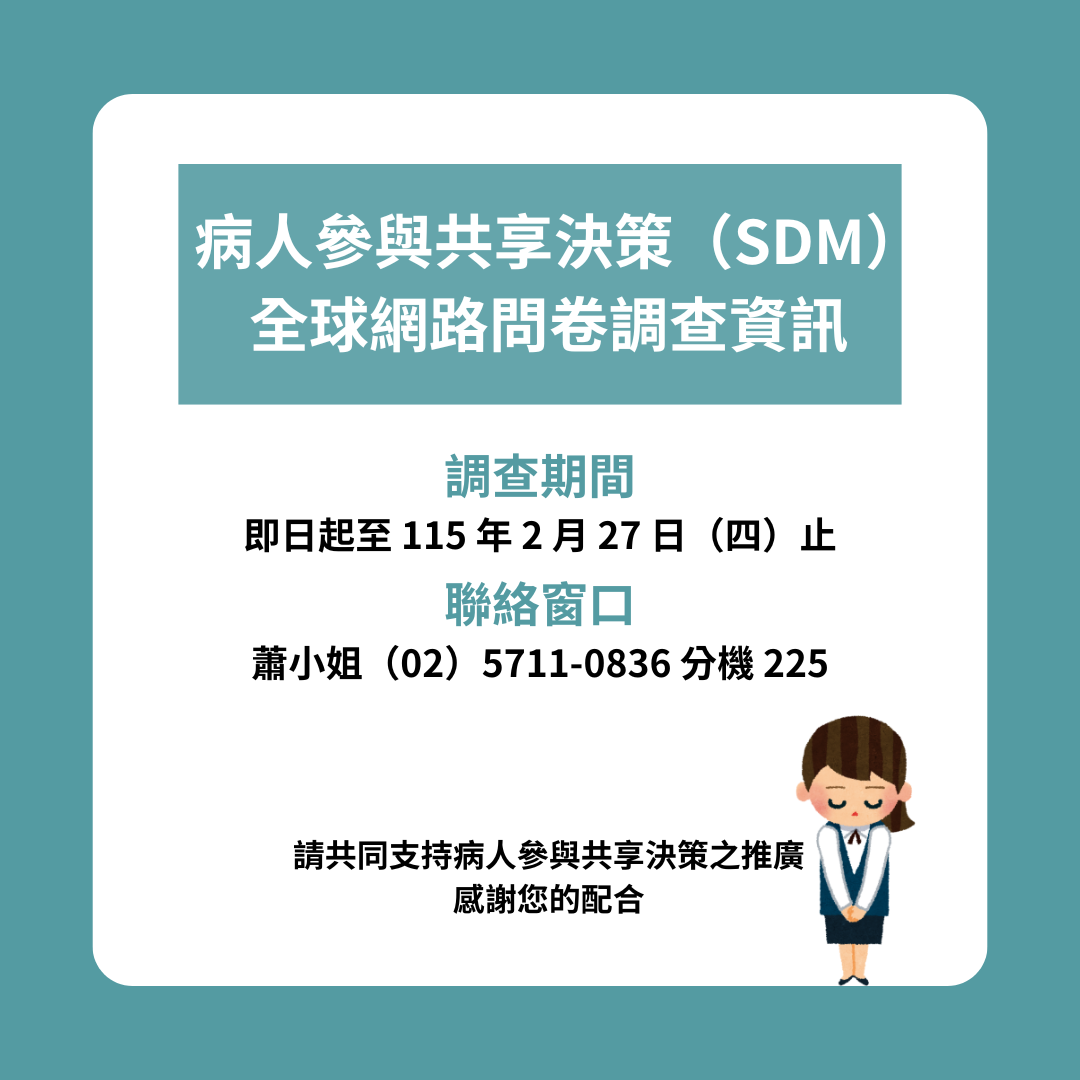 【活動相關】病人參與共享決策(SDM)全球網路問卷調查,歡迎踴躍填寫!