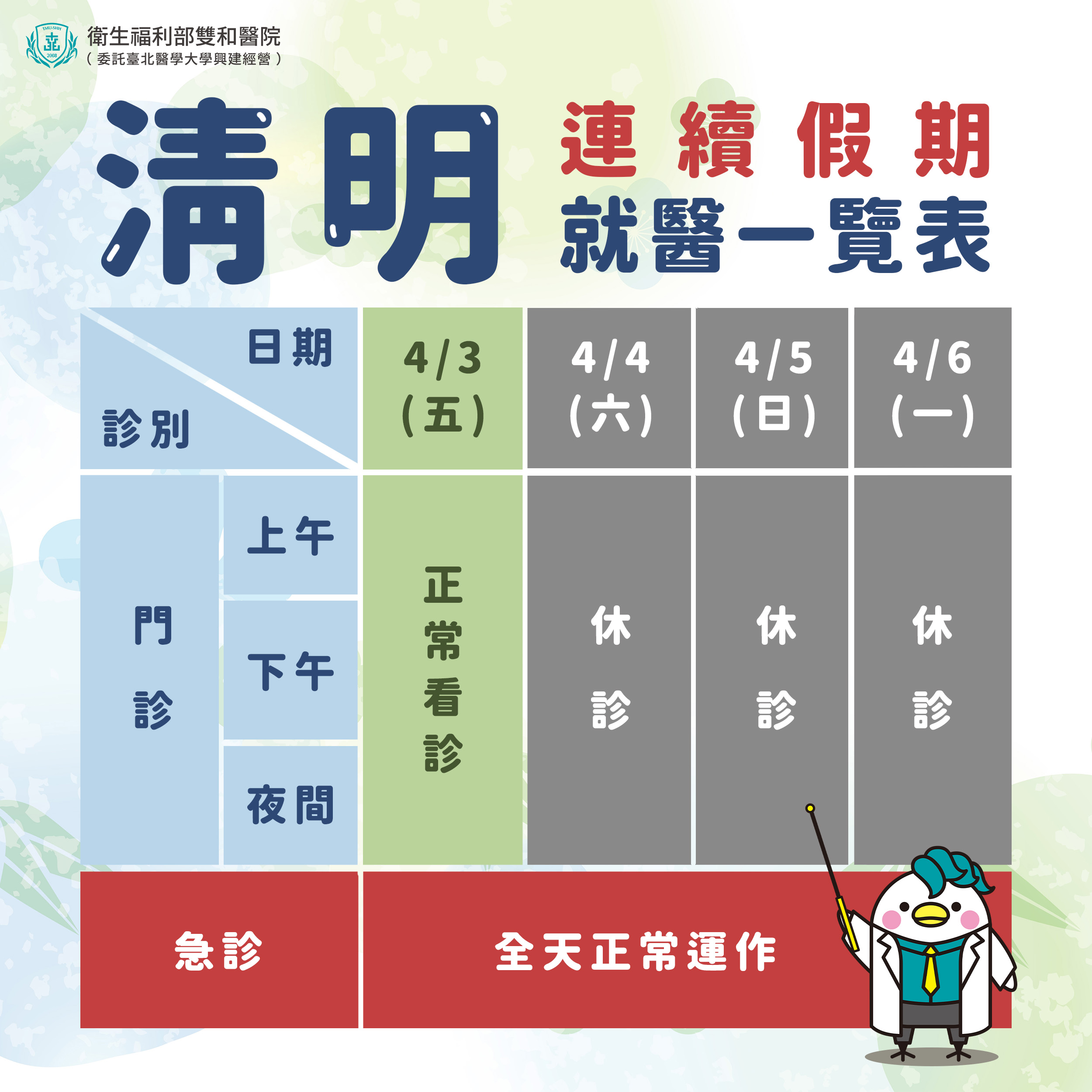 【重要公告】115年清明連續假期就醫一覽表